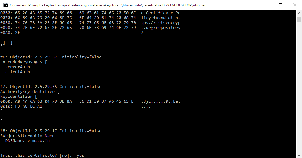 keytool -import -alias myprivateroot -keystore ..\lib\security\cacerts -file D:\Work\vtm\certificate_ssl\vtm.cer